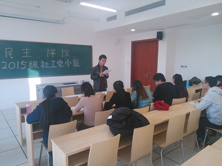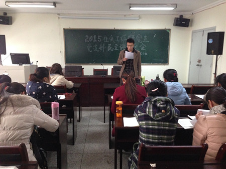 2015年12月7日,社会工作研究生党支部召开支部大会,2014级社会工作研究生党小组在兰州大学哲学社会学院304教室举行,2015级社会工作研究生党小组在南通校区1号教学楼204教室举行,学习《中国共产党廉洁自律准则》和《中国共产党纪律处分条例》,开展本年度党员民主评议活动。研究生辅导员安妮老师参加会议,会议分别由支部书记黄震宇、支部宣传委员杨雪主持,支部全体党员共23名参加了会议。