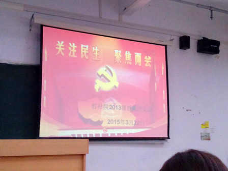 2015年3月22日,哲学社会学院2013级哲学班召开了以“关注民生,聚焦两会”为主题的团组织生活会。本次班会由2013级哲学班团支部负责主持,2013级哲学班同学全部到场并广泛参与,班会顺利进行了一个小时,收到了很好的效果。年全国人民代表大会和全国政治协商会议正在火热进行。“两会”中以民生问题为重点。2013级哲学班就以“关注民生,聚焦两会”为主题召开了半学期第二次班会。