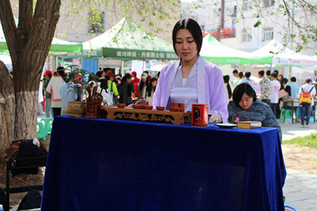 活动主题有“梦起长安”“丝路爱情”等。在开幕式表演上,国学社社员身着汉服,手持佩剑、轻撑绸伞,一礼一揖,展示了汉族礼仪风采。另外三位社员红衣起舞,和着悠悠丝竹,为我们带来一支《礼仪之邦》。 “看我泱泱礼仪大国,君子有为德远播。”在社团各自的展示区域,国学社为大家介绍了汉服服制,不少同学被汉服吸引,纷纷试穿并合影留念。兰州大学国学社联合甘肃五福茶艺职业培训学校精心准备了茶艺表演,邀请同学免费品尝了茶点,在五月骄阳下增添一缕清香。国学社是“梦起长安”主题的起点,曹红副校长携团委、社联的干部亲临指导,与兰州五福茶社负责人唐陈虎先生和兰州大学国学社的社员们进行了亲切交谈,感谢茶社对于学生社团的大力支持,并对国学社社团活动的开展给予肯定。国学社在五福茶艺学校的支持下新成立了尚汉茶艺队,为同学们提供了茶艺学习、茶道感悟的资源和机会。另外,还免费开设了形体课、古典舞教学等培训课程。除了汉服礼仪队和尚汉茶艺队,国学社还下设诗词楹联队,在现场筹划了对对联、诗词和韵等小活动,奉上了一场国学盛宴,吸引了大批同学。